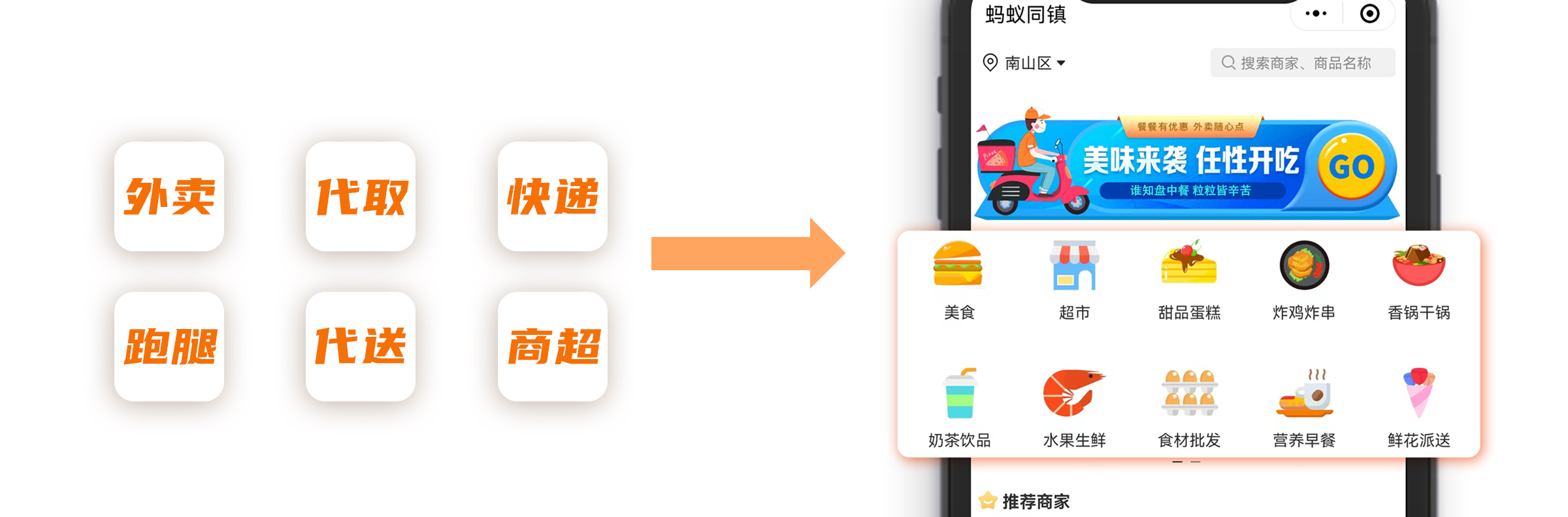 蚂蚁同镇拥有一套全面的同城服务平台O2O移动商城系统,可适应于多个服务场景。系统为您提供了独立的管理后台、商家端、配送端、用户端,同时为您提供全程运营支持。